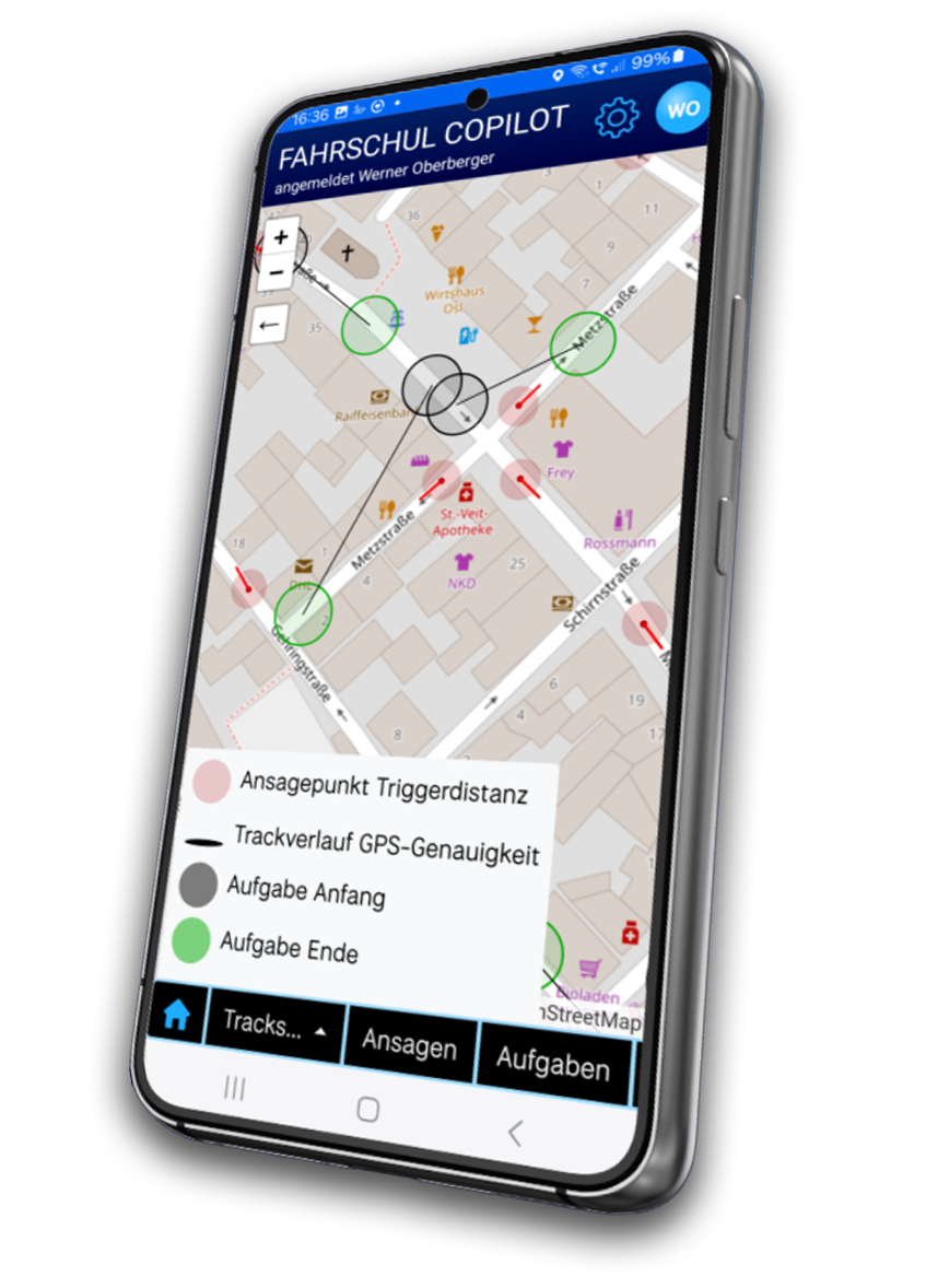 Neben allgemeinen Ansagepunkten (Geschwindigkeitshinweise, Kreuzungen usw.) können Sie Aufgabenpunkte für die Ausbildung in der App anlegen und beim Durchfahren automatisch protokollieren lassen.